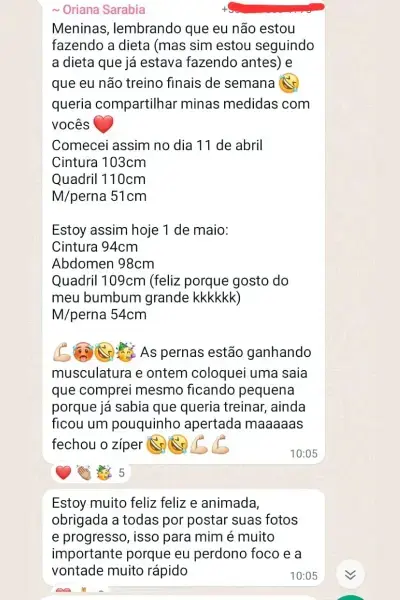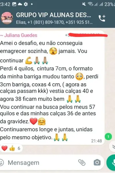 Através da nova metodologia prática que você terá acesso dentro do desafio, você verá que nos primeiros 7 dias: - Ser totalmente possível já eliminar 2 kg de gordura. - Ver a barriga sumindo e reduzindo 1 número da calça. - Reduzir os primeiros 5 centímetros de circunferência. - O intestino voltando a funcionar normalmente e você se sentindo mais bonita.